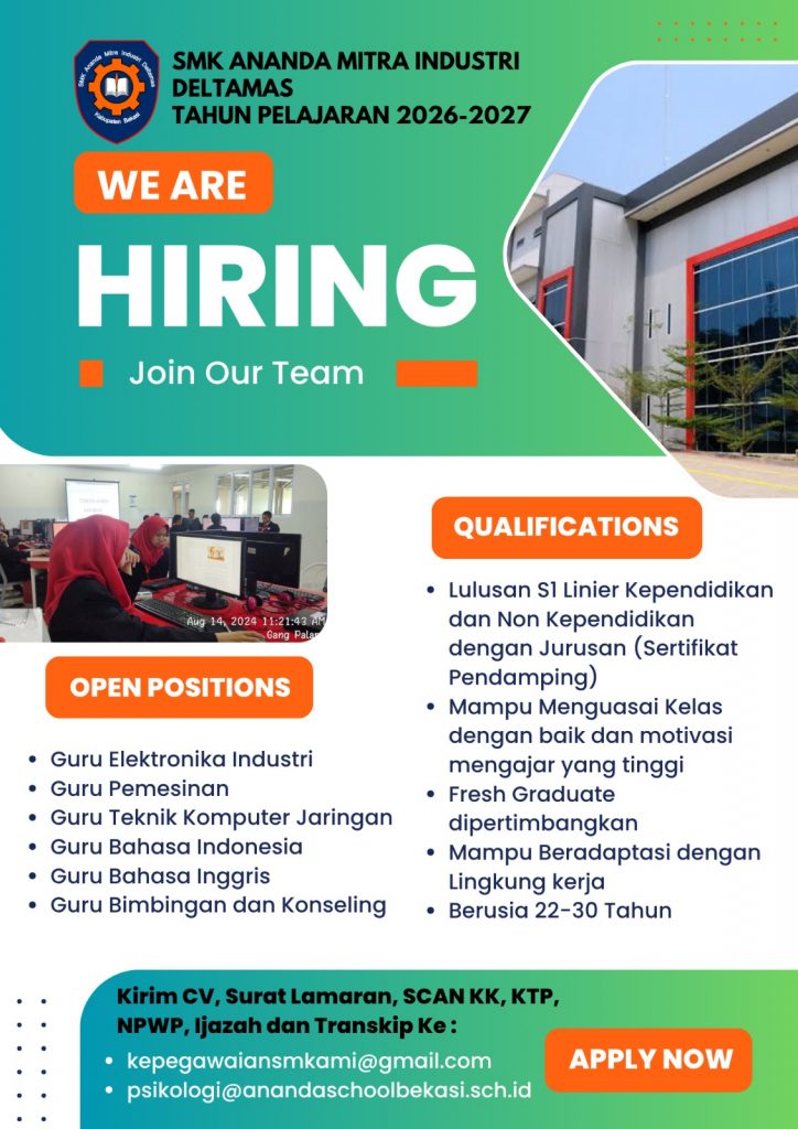 Karir GURU Catatan:Link resmi untuk registrasi karir guru SMK AMI hanya di website iniKami tidak meminta mentrasfer sejumlah uang ke rekening/e-wallet/dompet elektronik tertentu (jika meminta, jelas penipuan!)Kunjungi Instagram SMK kami: @smkami_deltamas Send E-Mail Karir Guru Lowongan Kerja Karir Guru Untuk Registrasi KARIR GURU SMK AMI Klik Disini